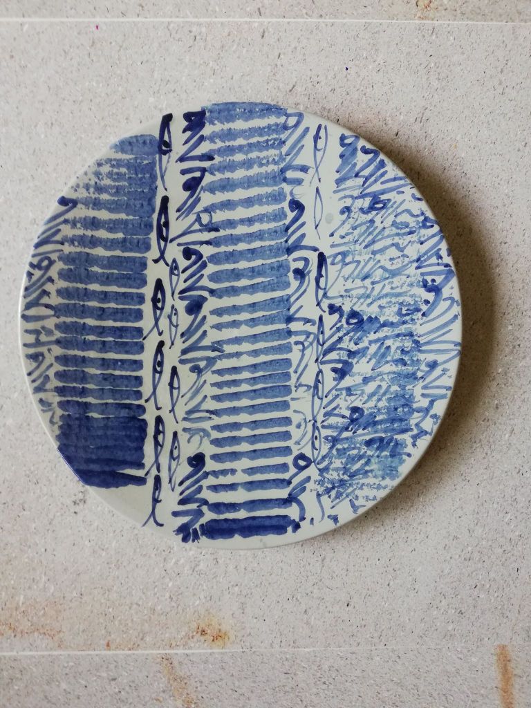 Cette assiette va bien au-delà de sa fonction utilitaire : elle devient une toile où le minimalisme des formes rencontre une richesse narrative. La palette sobre — bleu cobalt et noir sur fond blanc — confère une élégance intemporelle à l’objet, tout en mettant en valeur la complexité des motifs.