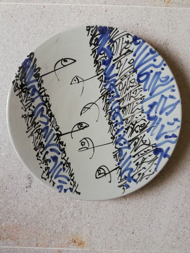 L’assiette se distingue par un enchevêtrement de motifs graphiques noirs et bleus, évoquant à la fois la calligraphie arabe et le mouvement spontané du geste. Les lignes courbes et fluides, parfois entrecoupées de traits anguleux, racontent une histoire riche d’influences culturelles. Amin Chaouali ne se contente pas de décorer ; il crée une véritable interaction visuelle qui capte le regard et invite à l’interprétation.